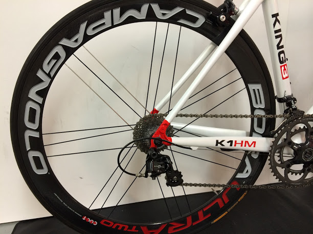 さらに、選りすぐった素材がもたらす高いねじり強度や耐久性は、裏打ちされた揺るぎない信頼性に到達し、その結果、優れたレスポンスや快適性を備えたKING3は、プロ選手の活躍にも貢献しています。インテグラルシートポストやケーブル内蔵型の筋肉質なフレーム構造を持ち、軽量化を図りながら、デザインとテクノロジーのコンビネーションを体現する最高峰の一台に、カンパニョーロのスーパーレコード11速にカンパニョーロのボーラウルトラを装着した車体です。