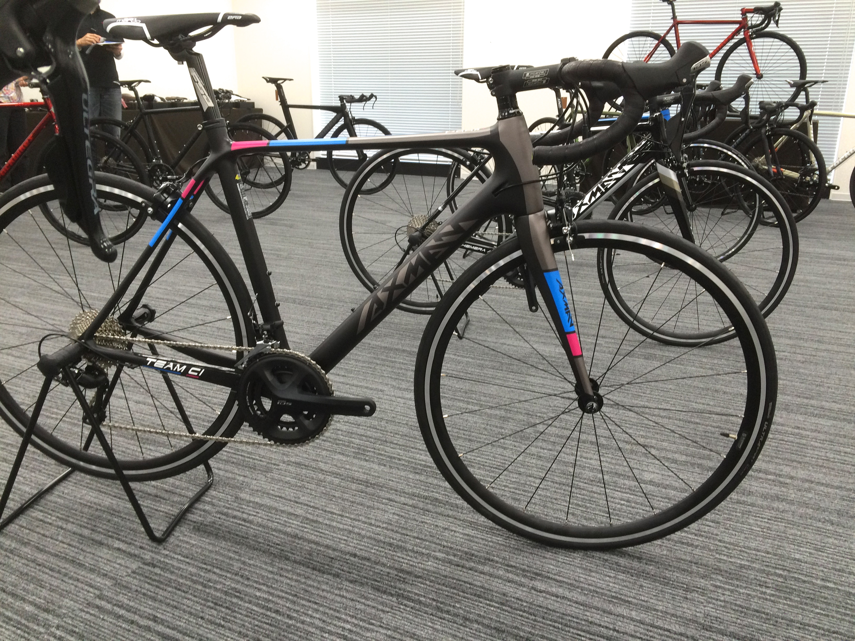 なかなか写真では伝わりづらいかと思いますが、曲線の美しさとバランスが非常に印象的な1台。戦うためのメジャーブランドのマシンとは違い、工芸品のような美しさをもったマシン。美しいだけではなく、アイデアが詰まったギミックに驚きました。エンドにこだわりがあって、120、130、135mmの幅に対応。しかも新しいデュラエースでも今回採用してきた、フラットマウントタイプのディスクにも対応。タイヤクリアランスは35cまで大丈夫との事で、この1台で色々なスタイルのマシンが組めてしまいます。フルブラックに見えますが、マットとグロスブラックのツートーンカラーと秀逸なセンス。これだけの内容でさらに東レのT800カーボン素材となれば、玄人も納得の1台。