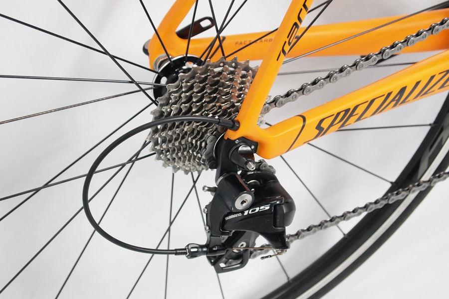 今回は最近入荷したスポーツバイクをご紹介していきます。始めは大人気のターマックからご紹介していきます。マットカラーのオレンジ色というのが逆に新鮮に感じますね。最近ではカーボンマシンも素材カラーのままのヌードカーボンといったカラーがトレンド的にはなくなっています。個人的にはカーボンの織り込みも見えるので好きですが。入荷のターマックはシマノの105セットアップで、ミドルクラスのライダーにピッタリの内容になっています。
